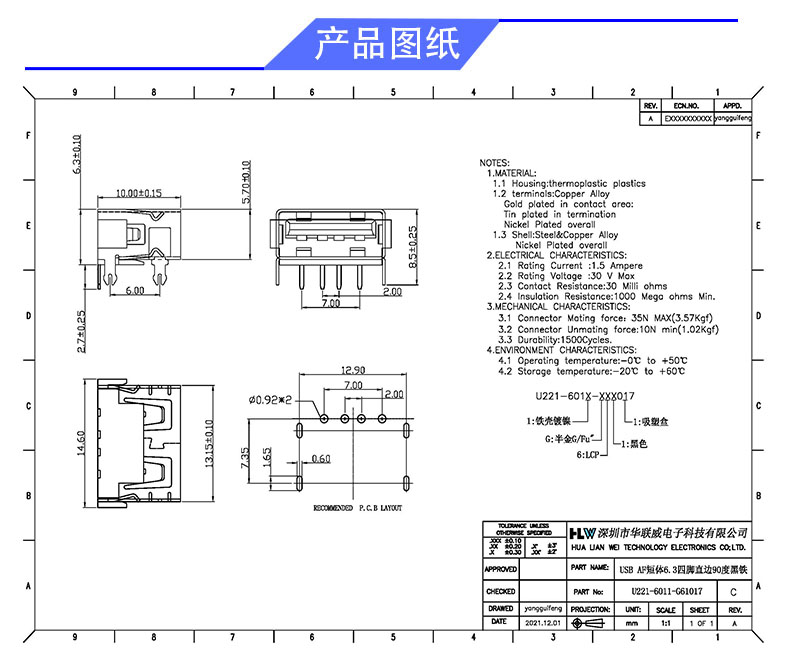 USB AF 短体长度10.0 高度6.3(无卷边 )